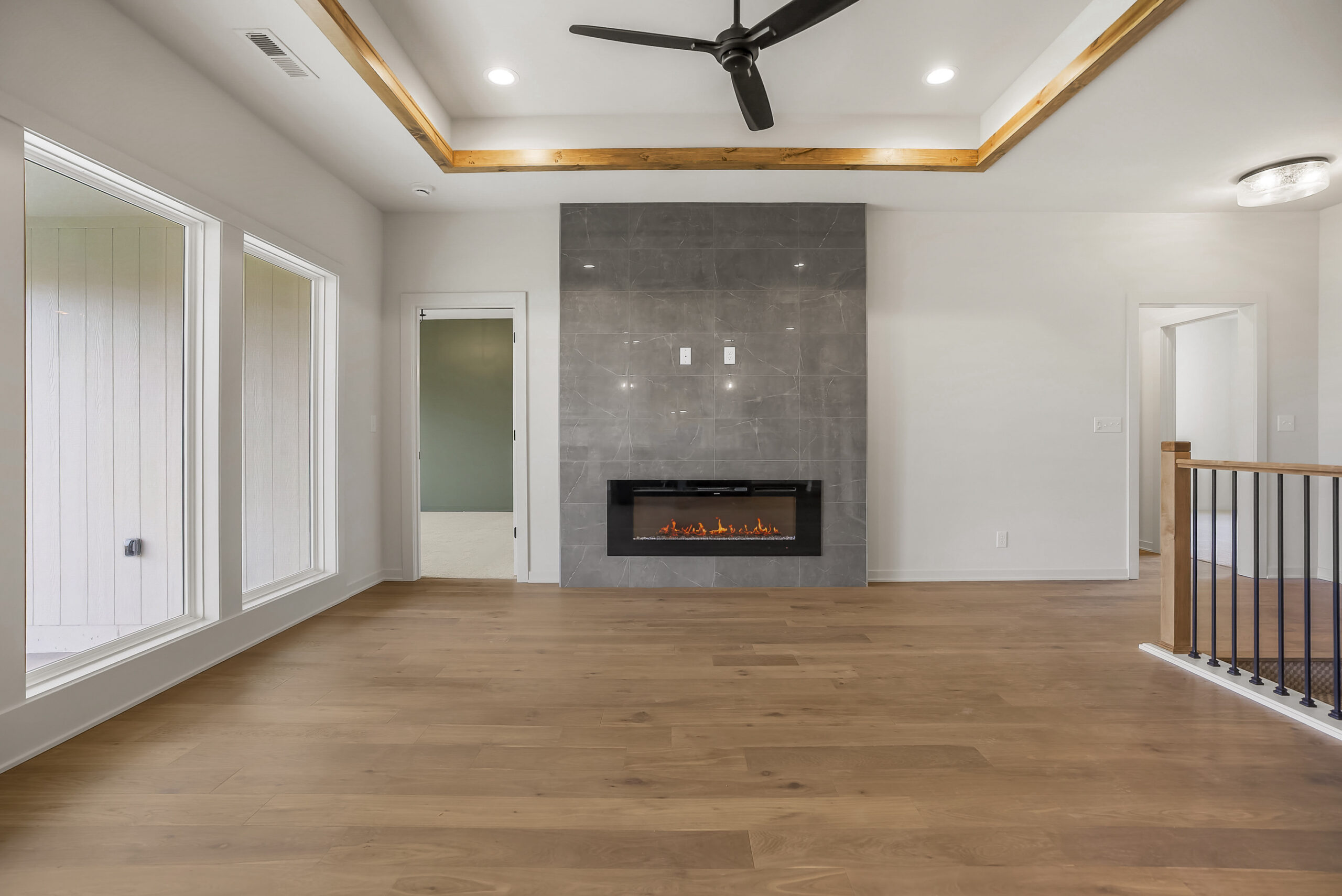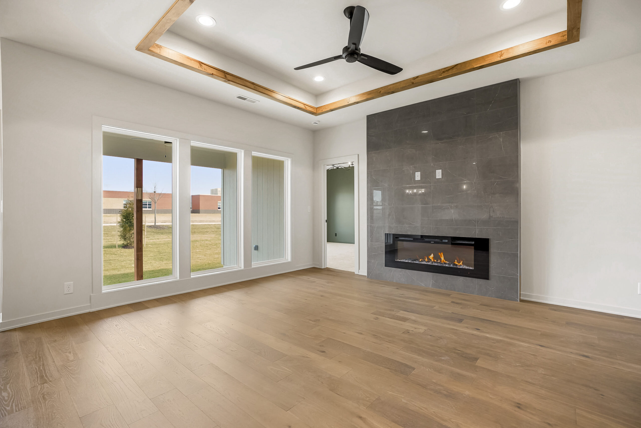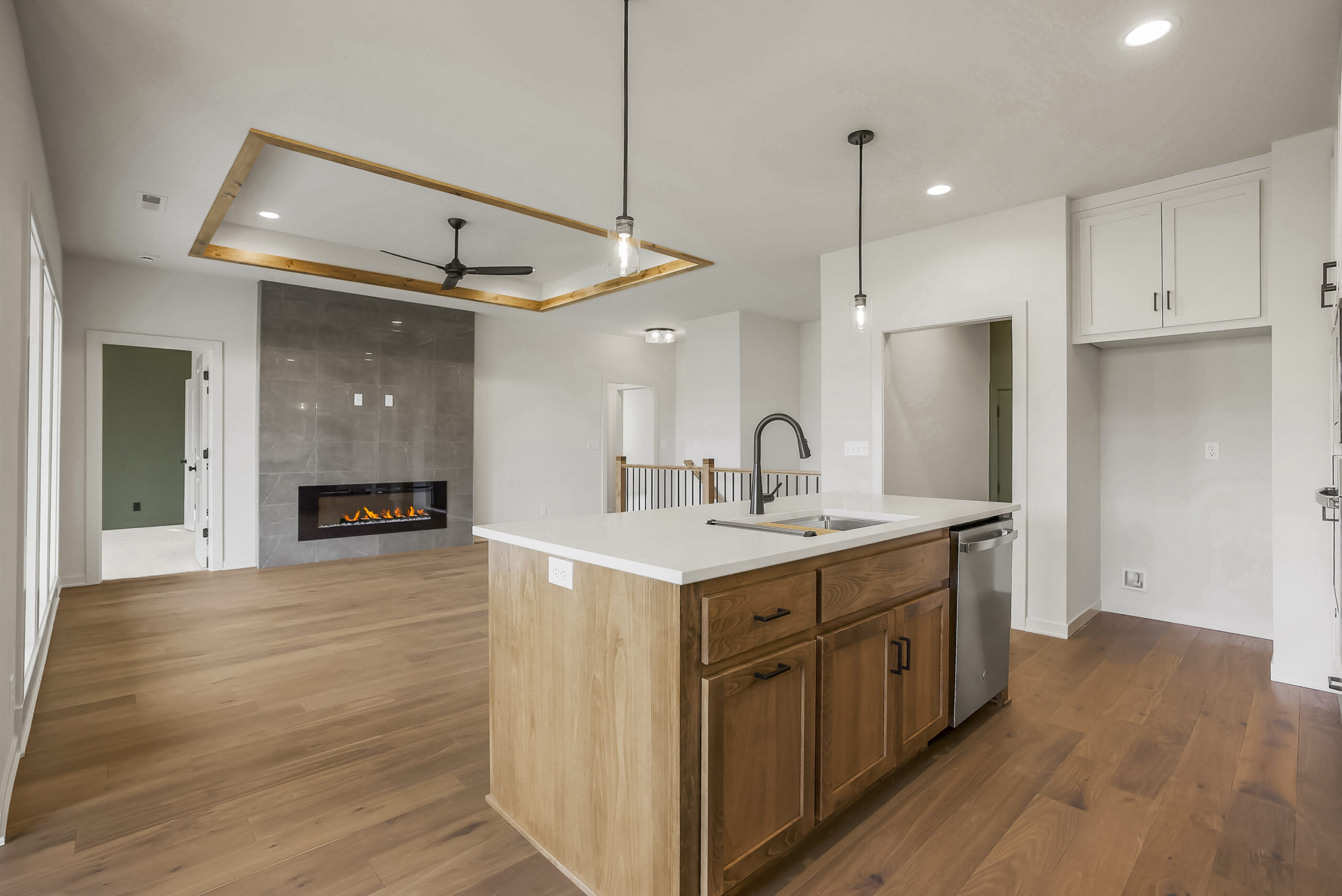On the main level, you’ll find a chef-inspired kitchen with a walk-in pantry, a striking fireplace that serves as the centerpiece of the living area, the spacious primary suite and second bedroom, and a covered rear patio that extends your living space outdoors—perfect for relaxing evenings.